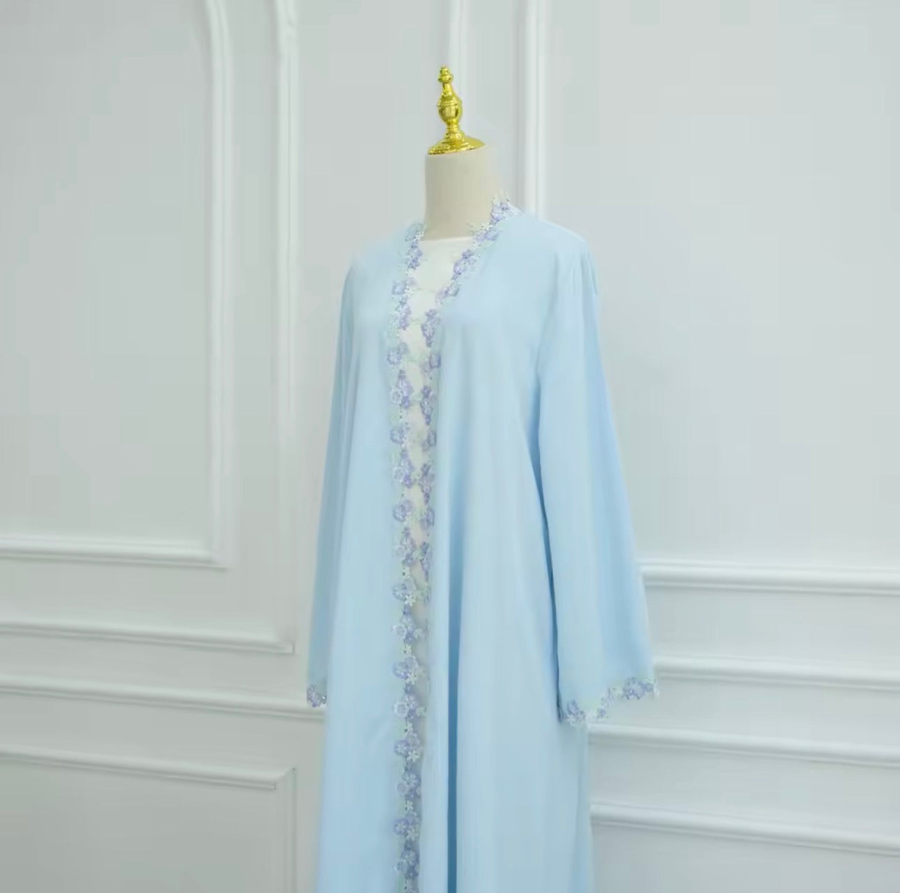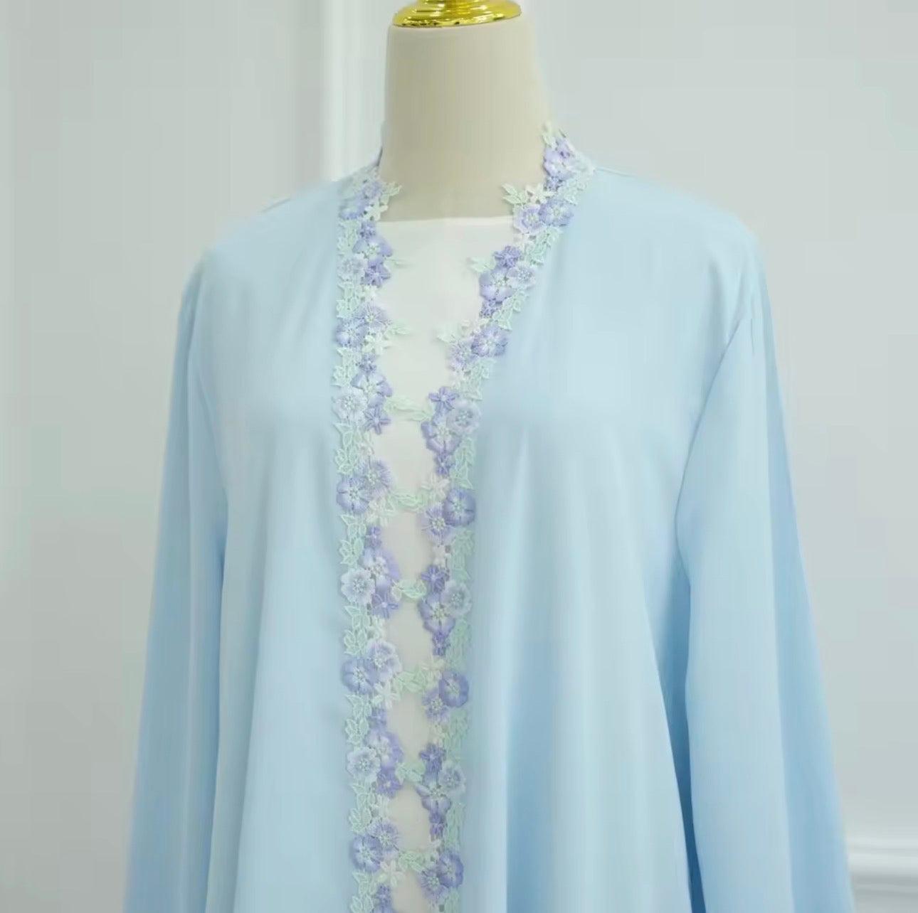 - Kimono abaya élégant en bleu pastel avec de délicates broderies florales.